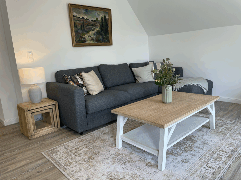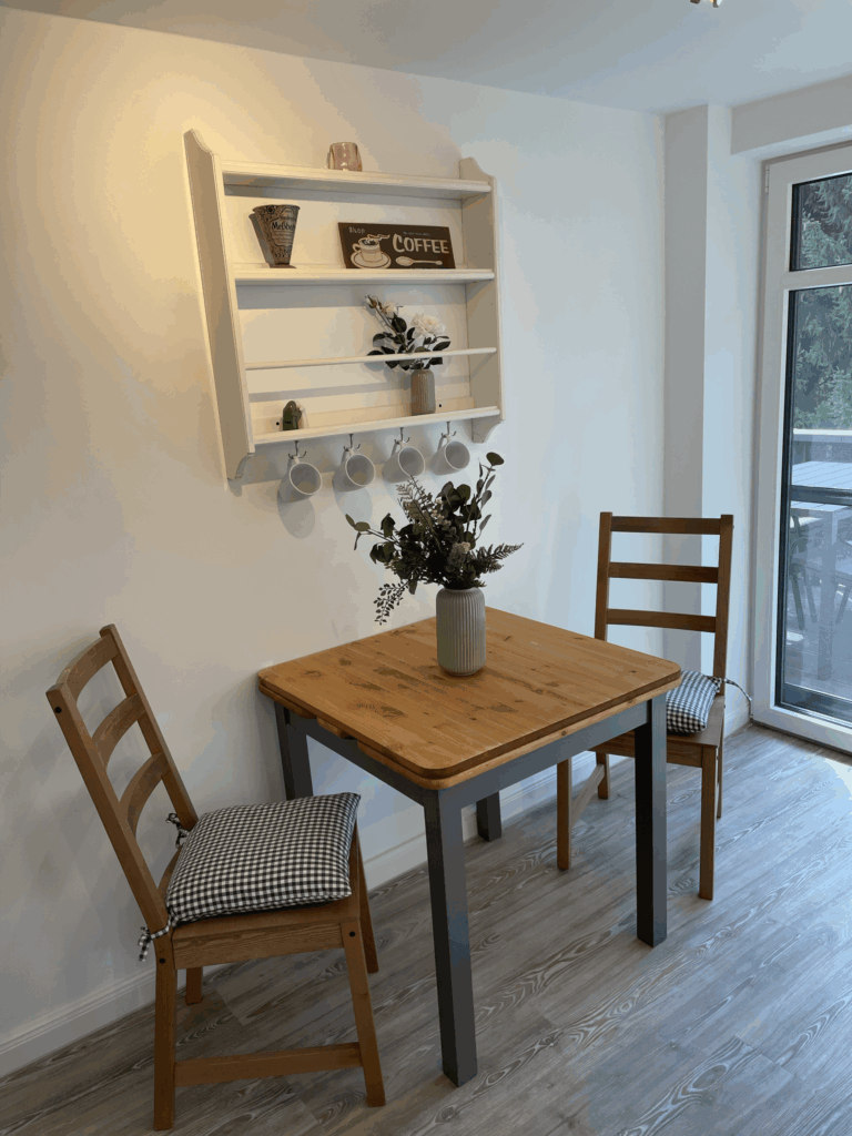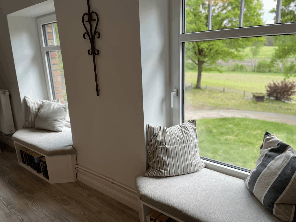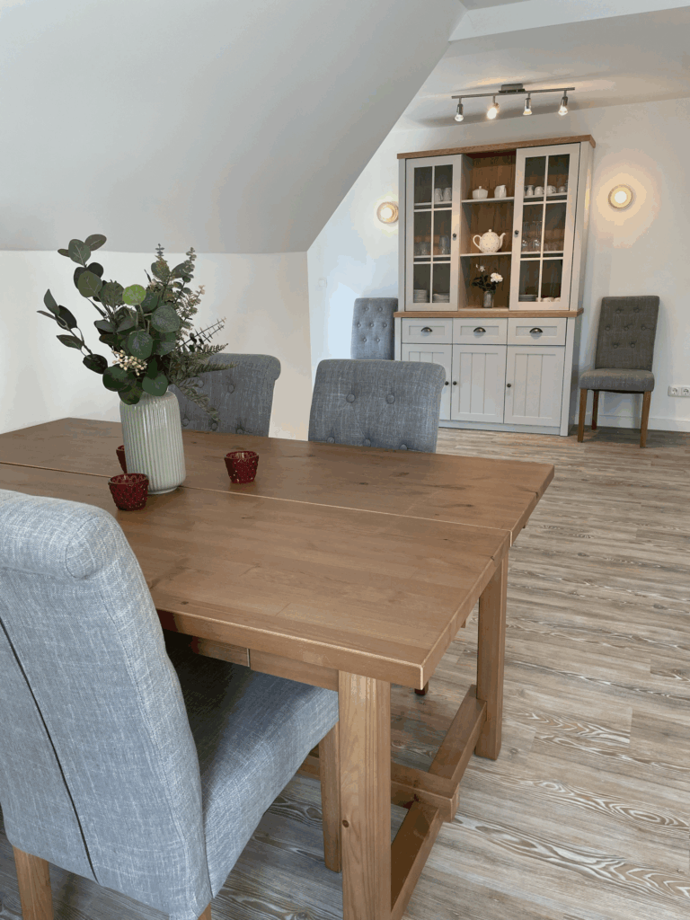 Absolutes Highlight der Wohnung sind die beiden Windowseats im Wohnzimmer, die einen wundervollen, weiten Blick über Felder und Wiesen bieten und wunderbar zum Beobachten von Reh, Fuchs und Hase sind, während man es sich mit einem Buch gemütlich gemacht hat. In dem gemütliche Wohn- und Esszimmer hat man bequem Platz sich eine schöne Zeit zu machen.